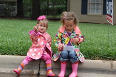 Me ‘n’ my sis enjoy few things more than we enjoy splashing in mud puddles after a nice rain shower. The Good Lord sent us a hefty amount of rain over a couple of days last month (but back to praying, as we are again already desperate for some more moisture around these parts) and we decided to put on our rain gear & head outside. We searched out worms & roly-polies… floated boats down the street, and played with Sage. The photos will speak for the fun we had. Bring on more rain!!!